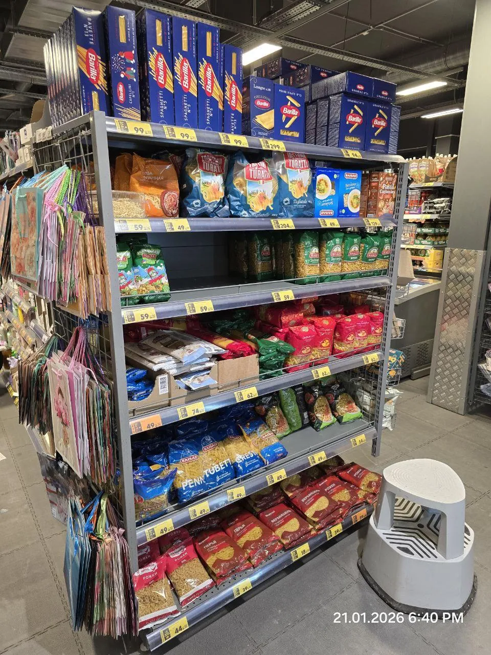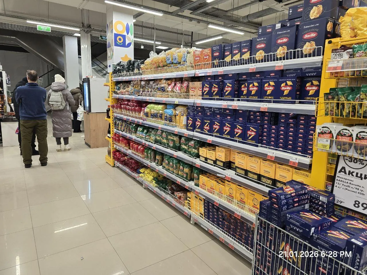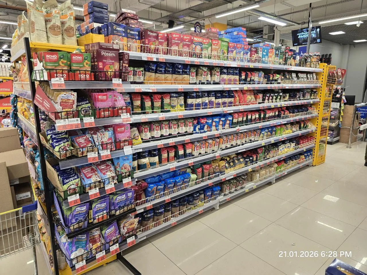 Как видно на кадрах, полки с крупами и макаронами (тем, что «сметают с полок» в первую очередь) заполнены.