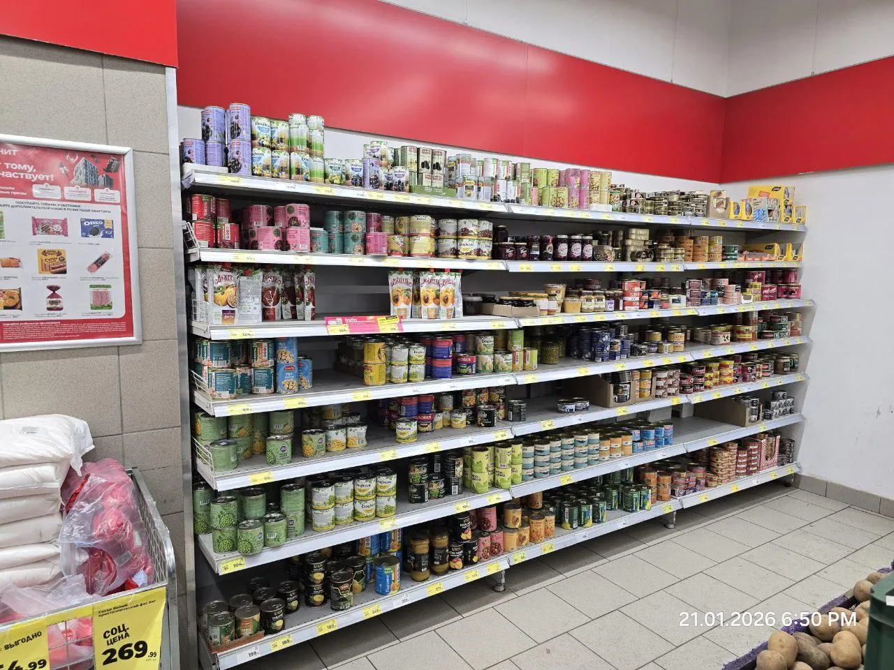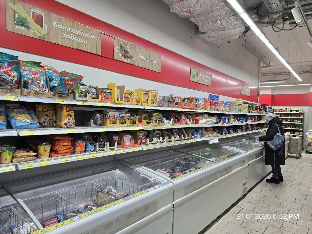 Крупы и колбасы тоже в достатке. Бакалея с естественным расходом, без признаков «сметания с полок».