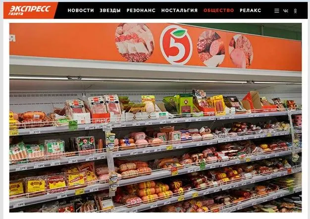 То, что кадр из «Экспресс-газеты» является донором, понятно по расположению продуктов на верхней полке. И тут же возникает вопрос, почему на верхней полке оставили изобилие колбас?