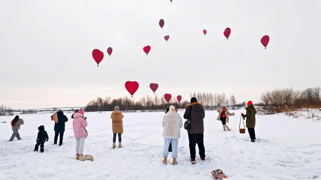 На земле праздничную атмосферу создавали тематические украшения: валентинки, шарики в виде сердец и стильная фотозона. Пилоты соревновались в меткости, сбрасывая маркеры в центр мишени прямо с высокого сугроба. Для гостей работали точки с горячей пищей, глинтвейном и сувенирами.