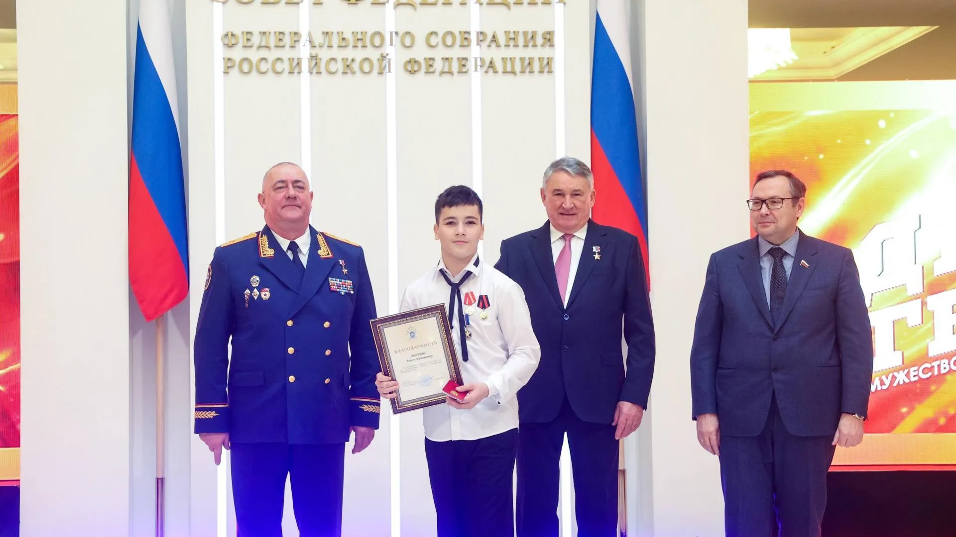 XII торжественная церемония награждения детей и подростков, проявивших мужество в экстремальных ситуациях, состоялась в Совете Федерации. В числе 19 юных героев был и 13-летний Амир Абачев из города Домодедово.