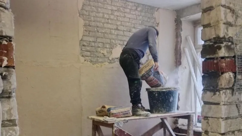 Ежедневно здесь работают более 50 человек и две единицы техники. Сейчас демонтажные работы подходят к концу, рабочие ведут отделочные работы, ремонтируют кровлю и монтируют инженерные коммуникации. Подрядчик приступил к фасадным работам.