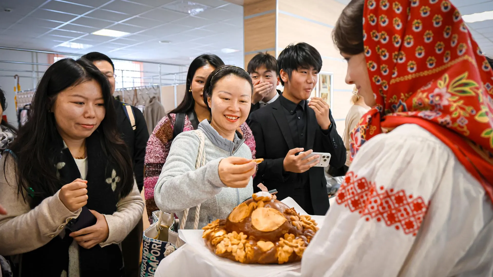 Утро началось с традиционного русского гостеприимства: воспитанницы местной школы в народных костюмах под звуки балалайки пели, танцевали и водили хороводы с китайскими музыкантами.