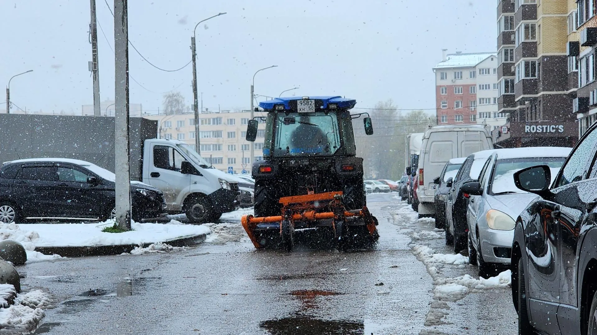 В поселке Свердловский специалисты «Жилспектра» очищают от снега дворовые проезды и тротуары. Из-за повышенной влажности снег становится тяжелым, что создает трудности для автомобилистов, мам с колясками и пожилых людей.