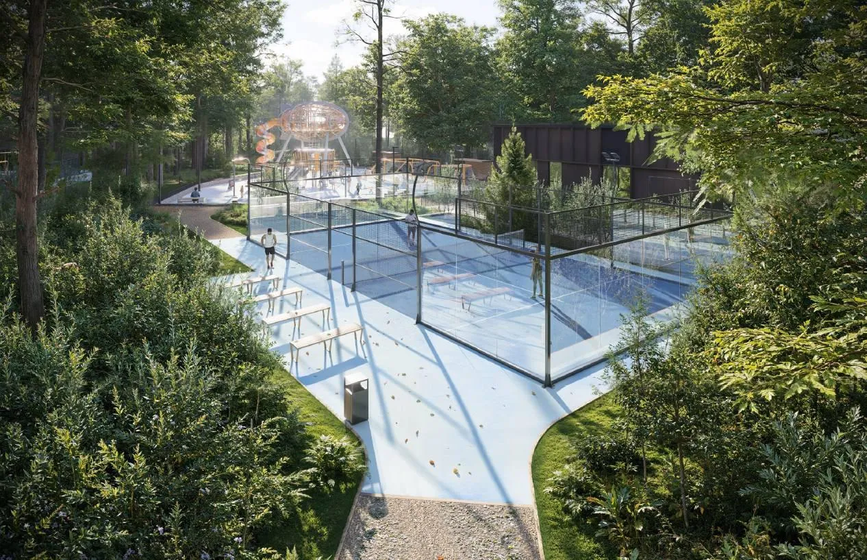 Жители получат возможность играть в падел-теннис в специальной зоне. Кроме того, на территории откроют туалет, комнату матери и ребенка и пост охраны.