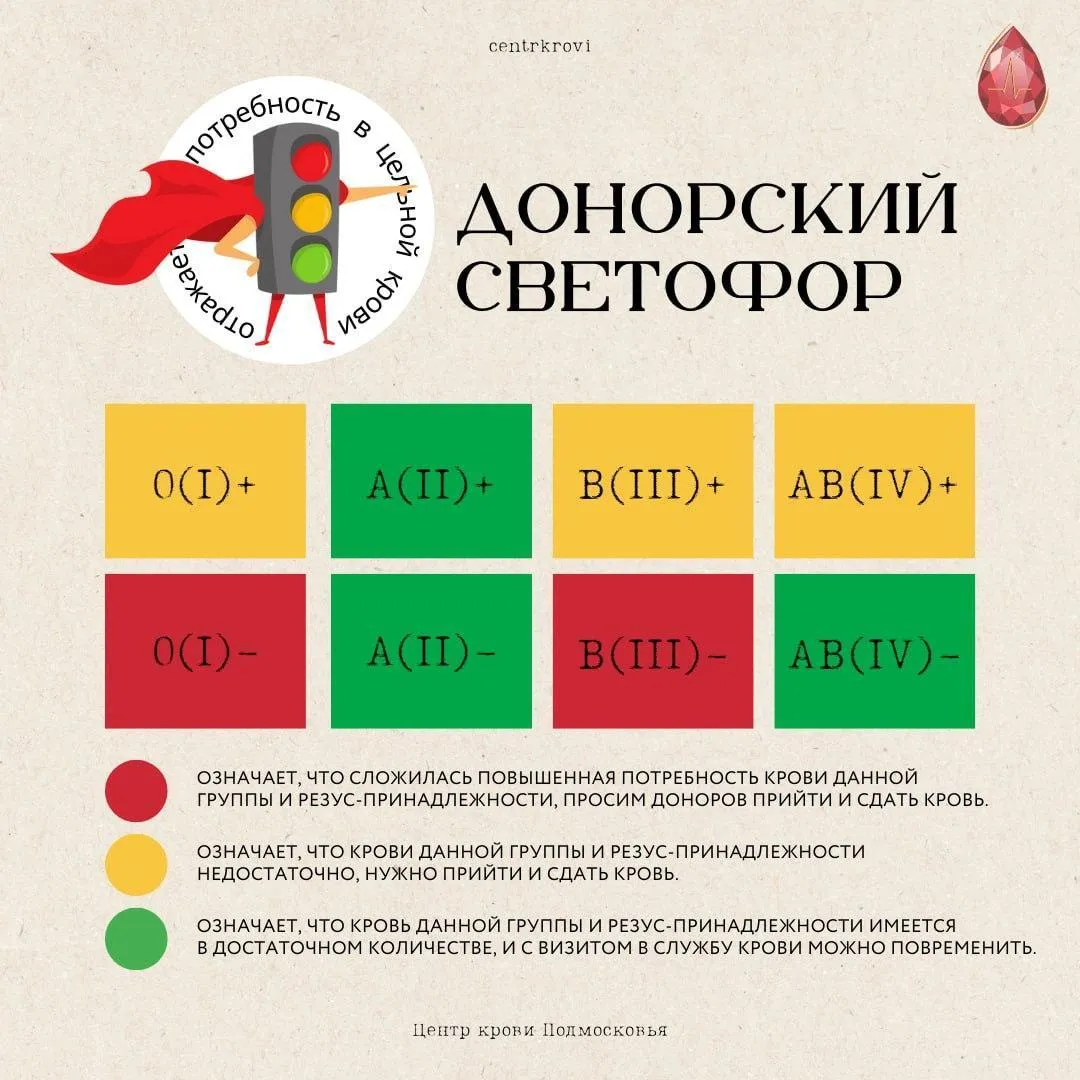 Московский областной центр крови обновил донорский светофор. Эти данные показывают, каких групп биоматериала не хватает в медицинских учреждениях региона.
