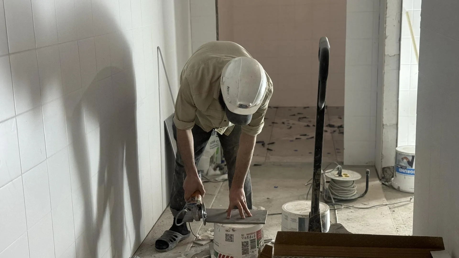 Строительство современного детского сада на 300 мест продолжается в жилом комплексе «1-й Донской». Специалисты приступили к внутренней отделке помещений — укладке плитки и покраске стен.