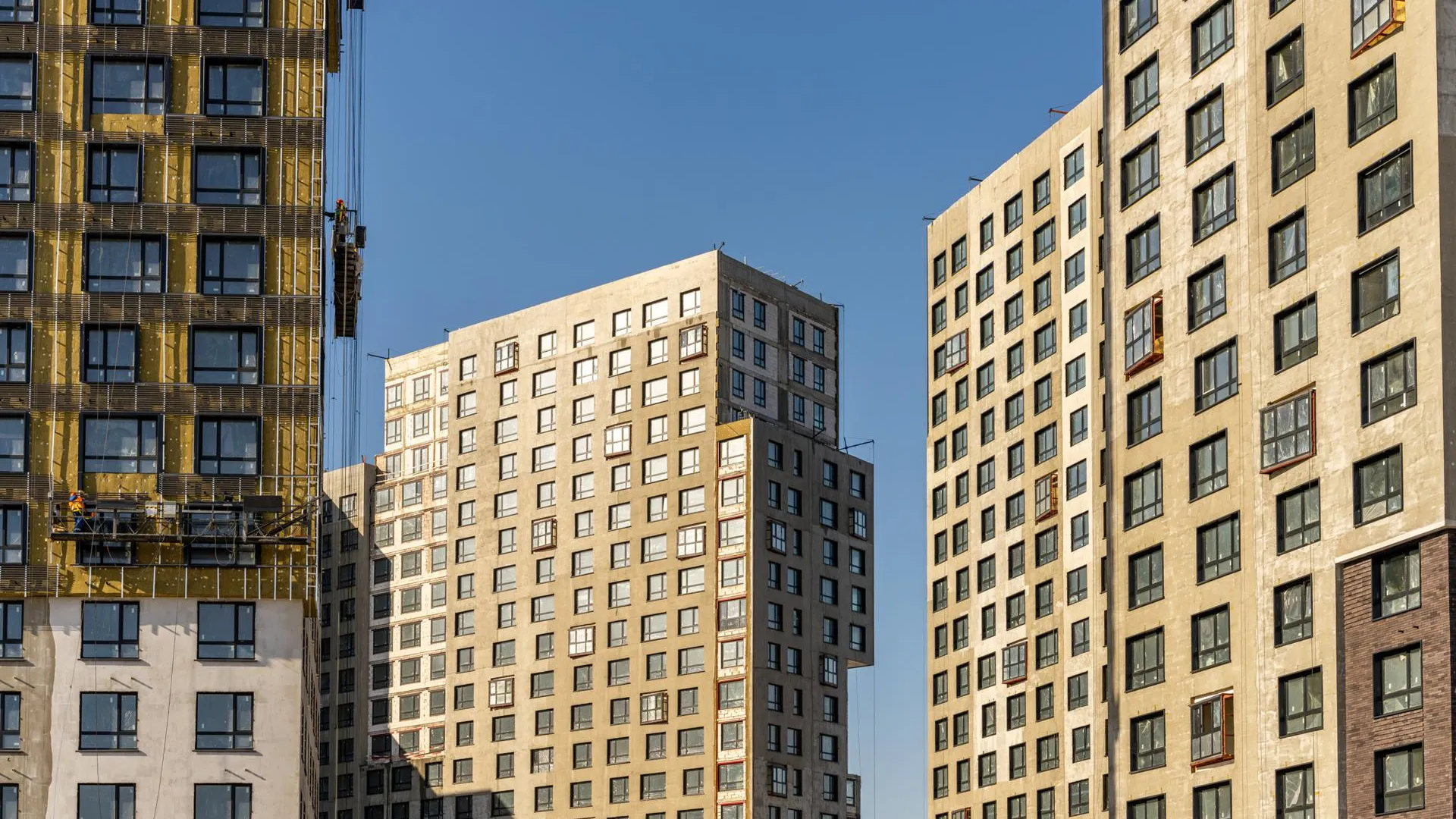 Специалисты сосредоточены на внешней отделке здания: фасадные работы проходят во всех секциях — с первой по восьмую. Параллельно с этим они прокладывают инженерные коммуникации.