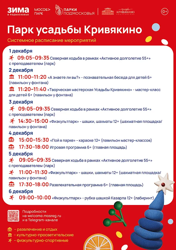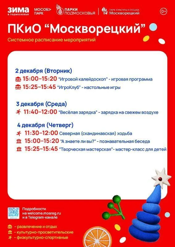 В парке «Москворецкий» во вторник, 2 декабря, пройдет игровая программа для детей, а также можно будет поиграть в настольные игры. В среду, 3 декабря, состоится традиционная «Веселая зарядка» для детей. В четверг, 4 декабря, посетителей приглашают на мастер-класс и познавательную беседу «А знаете ли вы?». Для любителей активного образа жизни и участников программы «Активное долголетие» проведут занятия по северной ходьбе.