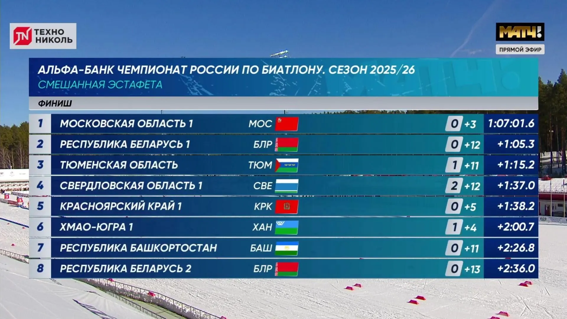 Второе место заняла команда Белоруссии, а бронзовыми призерами стали биатлонисты из Тюменской области.