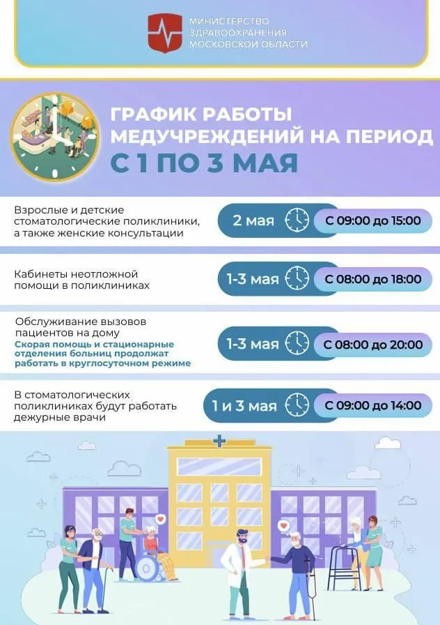 Жителям Московской области представили официальный режим работы медицинских учреждений на предстоящие майские праздники. Речь идет о первых длинных выходных – с 1 по 3 мая.