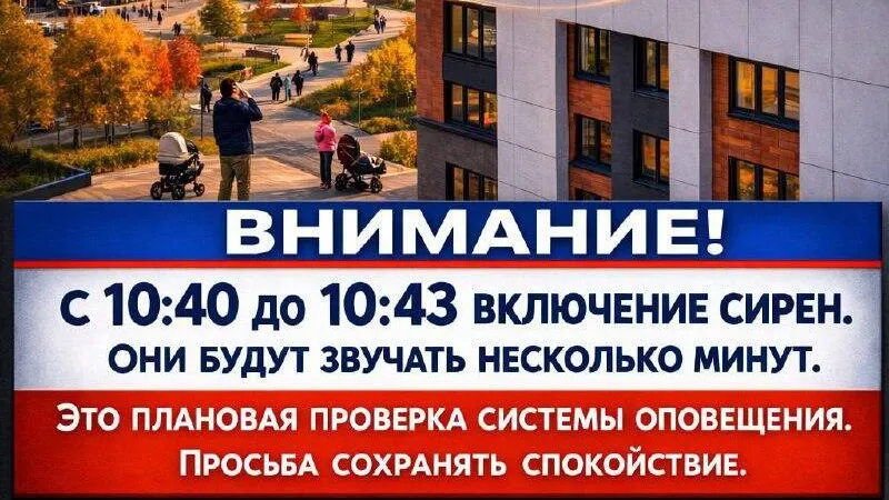 В рамках проверки задействуют электросирены. В 10:43 прозвучит сигнал «Внимание всем!». Одновременно по телевидению и радио передадут сообщение: «Проводится проверка готовности системы оповещения населения! Просьба сохранять спокойствие!».