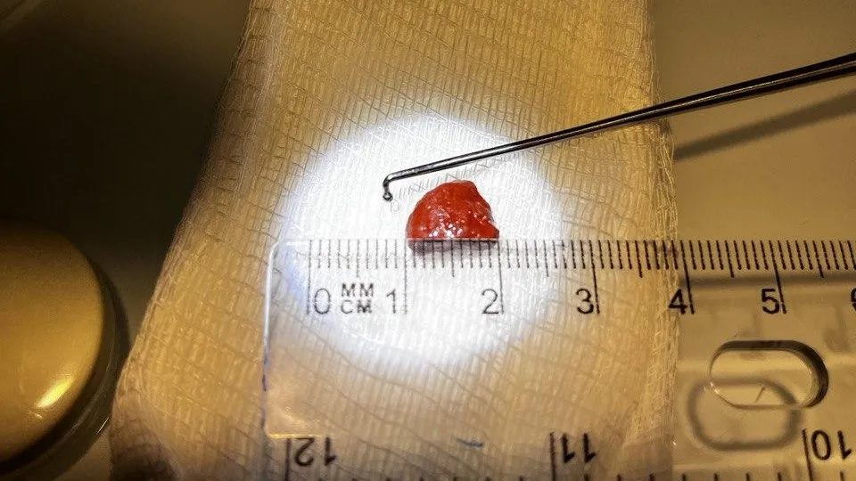 «В ходе эндориноскопии, исследования носовой полости, мы обнаружили инородное тело размером около сантиметра в левом общем носовом ходе. С помощью эндоскопического крючка камень был аккуратно извлечен. Вся процедура заняла не более пяти минут и прошла без осложнений», — пояснил оториноларинголог Роман Удод.