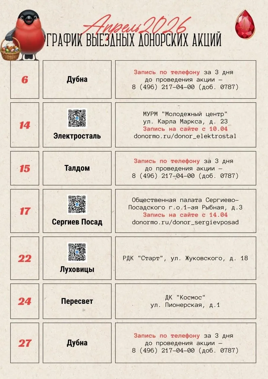 Мобильные бригады центра посетят Электросталь, Дубна, Талдом, Сергиев Посад, Луховицы и Пересвет. В ряде городов участие возможно только по записи. В Электростали регистрация откроется на сайте 10 апреля, в Дубне и Талдоме записаться можно по телефону +7 (496) 217-04-00 (добавочный 0787), начиная за три дня до даты акции, а в Сергиевом Посаде онлайн-запись станет доступна с 14 апреля.
