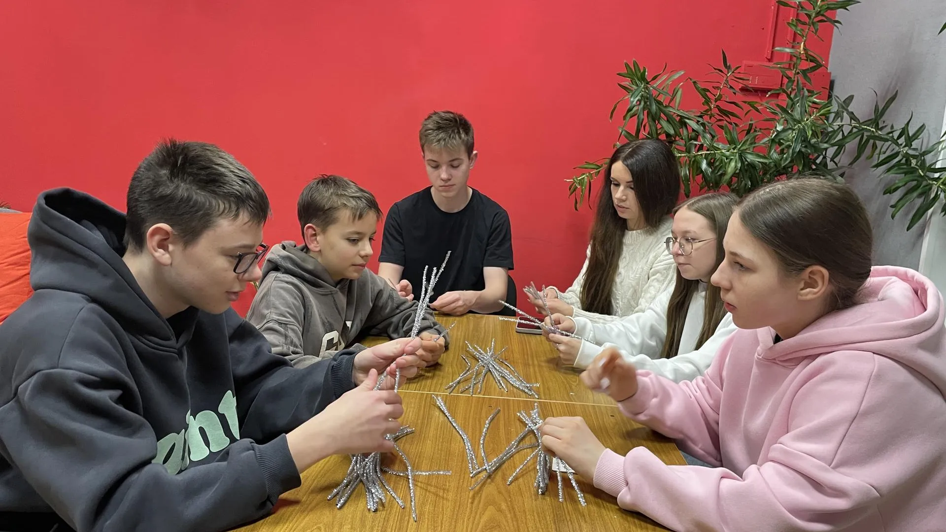 В ходе занятия молодые люди изучили свойства гибкого и безопасного материала — синельной (пушистой) проволоки, которая легко принимает и сохраняет нужную форму. Освоив техники скручивания и соединения элементов, каждый участник создал свою уникальную снежинку, проявив художественный вкус и внимание к деталям.