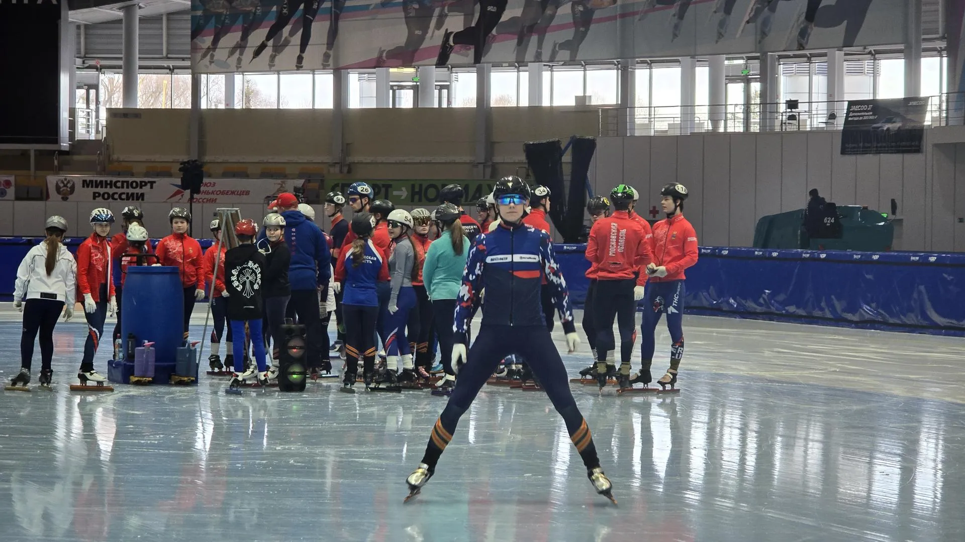 На базе конькобежного центра «Коломна» группа шорт-трекистов проводит тренировку. Для них это возвращение к привычному ритму после одного из главных стартов сезона — Первенства России по шорт-треку.