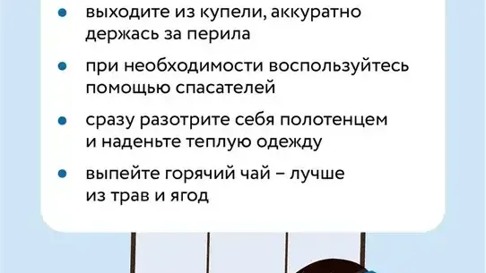 Он также добавил, что после выхода из воды не стоит растираться снегом, так как это травмирует кожу и не согревает. Нужно энергично обтереться полотенцем, как можно быстрее надеть сухую одежду и выпить горячий чай.
