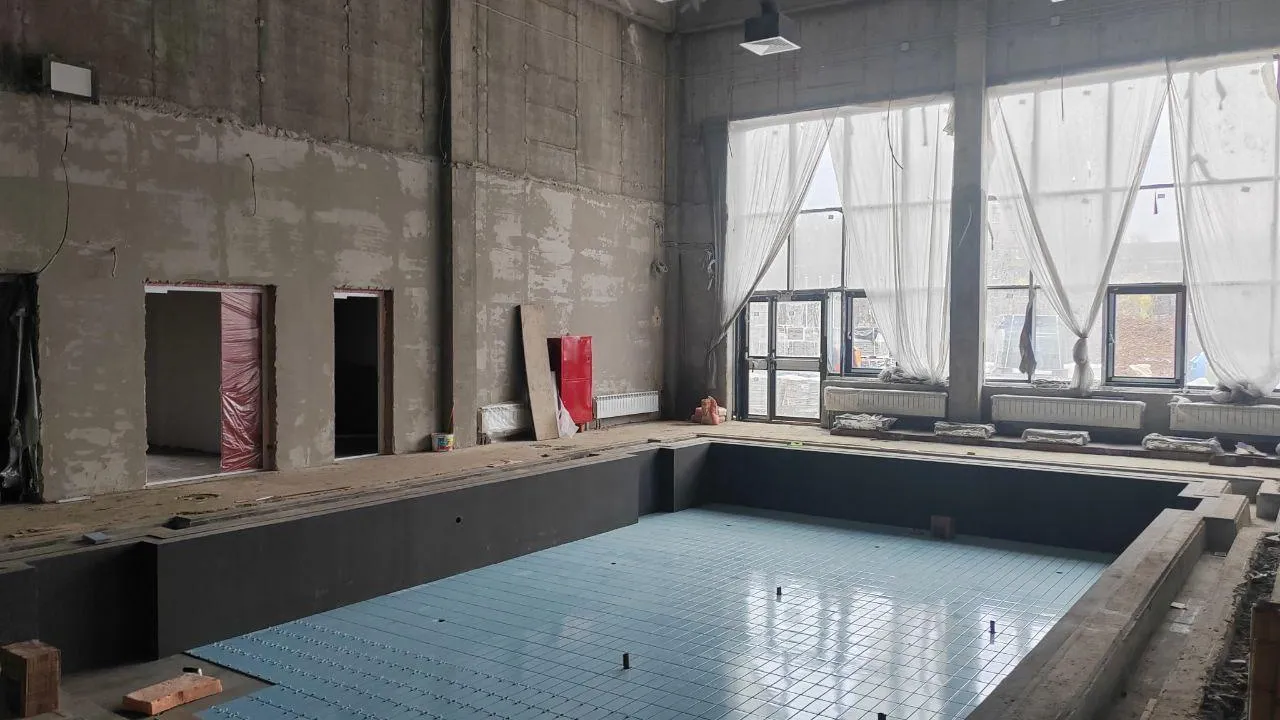 Сейчас в здании обстраивают покрытие пола и стен в коридорах и на лестницах, продолжают монтаж внутренних коммуникаций и ведут облицовку бассейна керамической плиткой