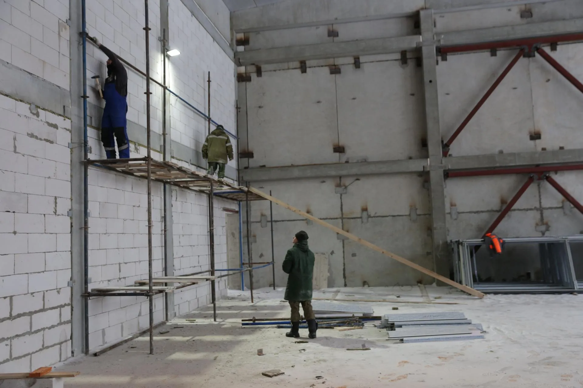 Специалисты занимаются устройством кровли и внутренних инженерных сетей, устанавливают лифты и алюминиевые конструкции: витражи на лестничных маршах, в спортзалах и актовом зале. Работы выполняет подрядчик «Крост-Д». На объекте задействовано более 120 рабочих и 10 машин.