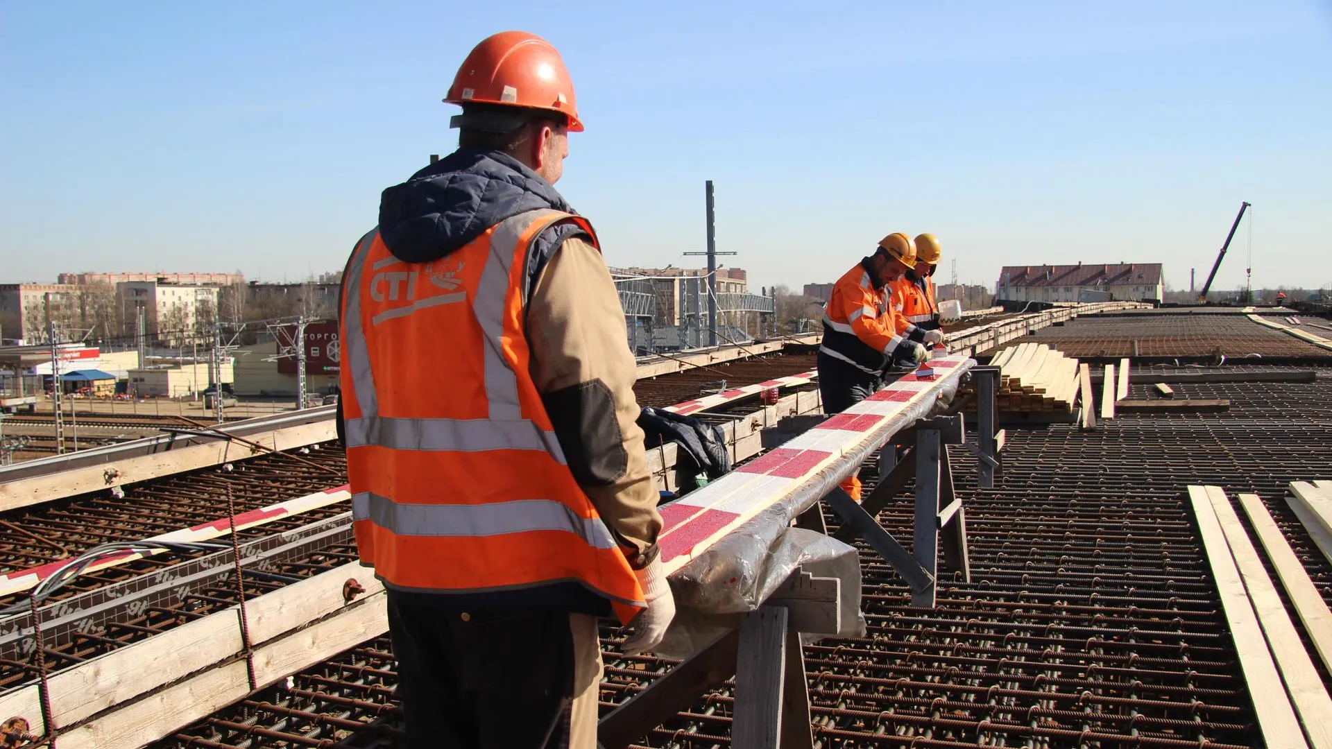 На пролетном строении уже смонтирована опалубка и установлена арматура для будущей железобетонной плиты. Рабочие готовят временные ограждения в местах с большим перепадом высоты. Стойки уже окрашены в красно-белый сигнальный цвет для лучшей видимости. Также проводится антикоррозийная обработка металлических конструкций специальным составом.