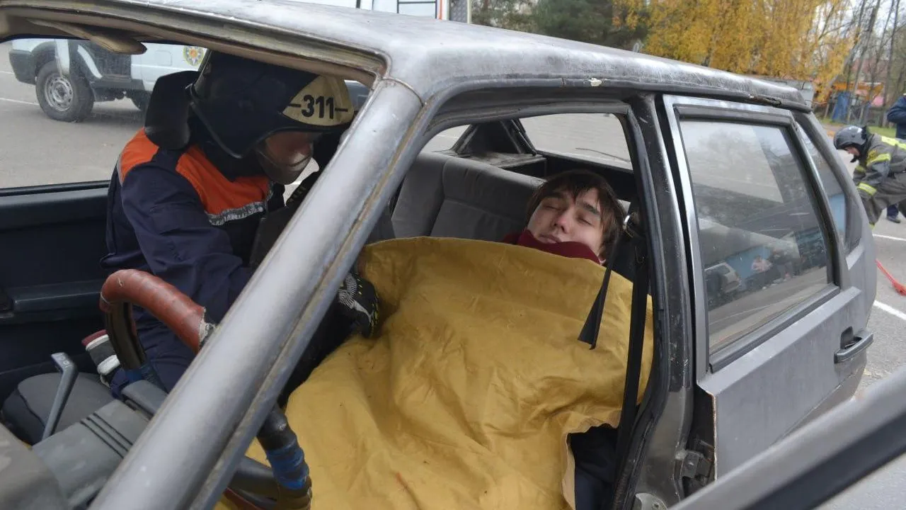 На учебном полигоне техникума специалисты смоделировали аварийную ситуацию с пострадавшими и возгоранием автомобиля. Сначала экипаж Госавтоинспекции оградил место происшествия и организовал проезд машин экстренных служб. Спасатели осмотрели пострадавших, стабилизировали транспортные средства и отключили аккумуляторы, чтобы вытащить людей из ловушки. После оказания первой помощи пострадавших передали передвижной бригаде реанимации. Пожарно‑спасательный расчет очистил проезжую часть от пролившегося топлива.