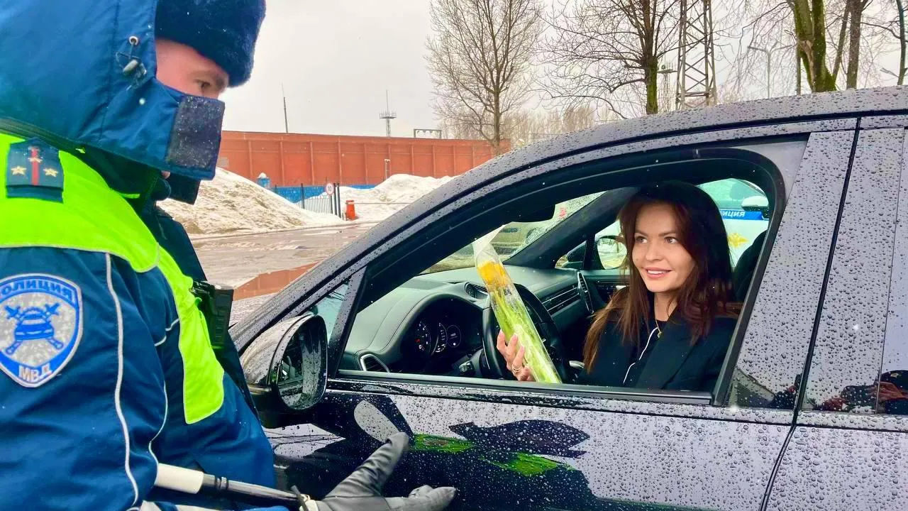 Сотрудники Госавтоинспекции поздравили женщин-водителей с наступающим 8 Марта. Акция «Цветы для автоледи» прошла в Балашихе накануне Международного женского дня.