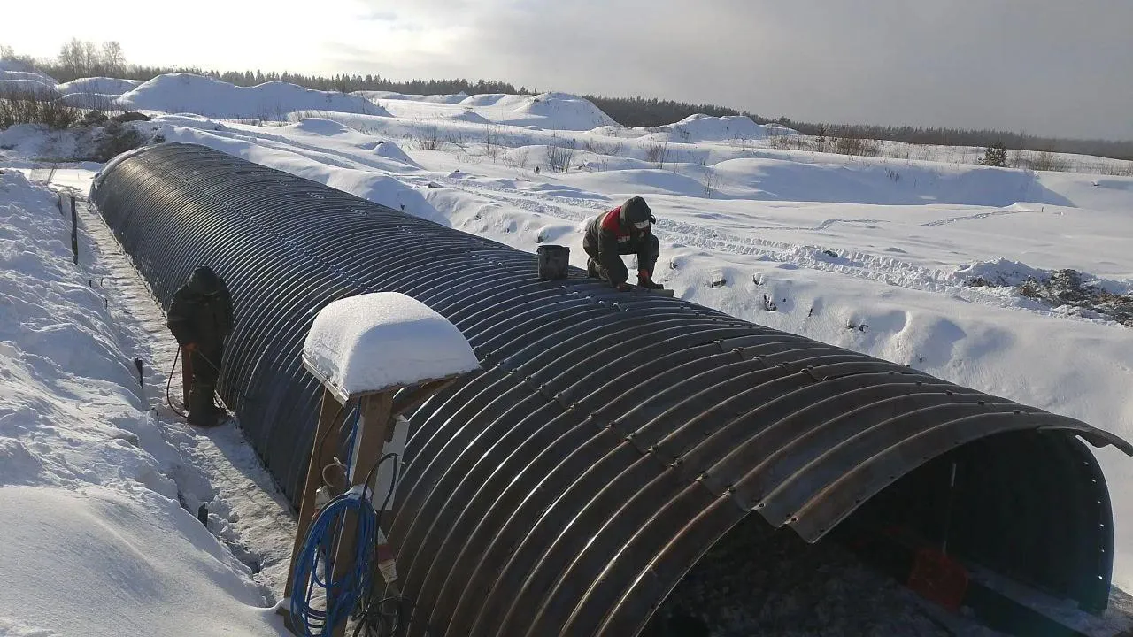 На площадке уже уложили бетонное основание для арочного сооружения длиной 27 метров. С двух сторон от него появятся насыпи, а затем и сама дорога. Сейчас рабочие занимаются гидроизоляцией трубы.