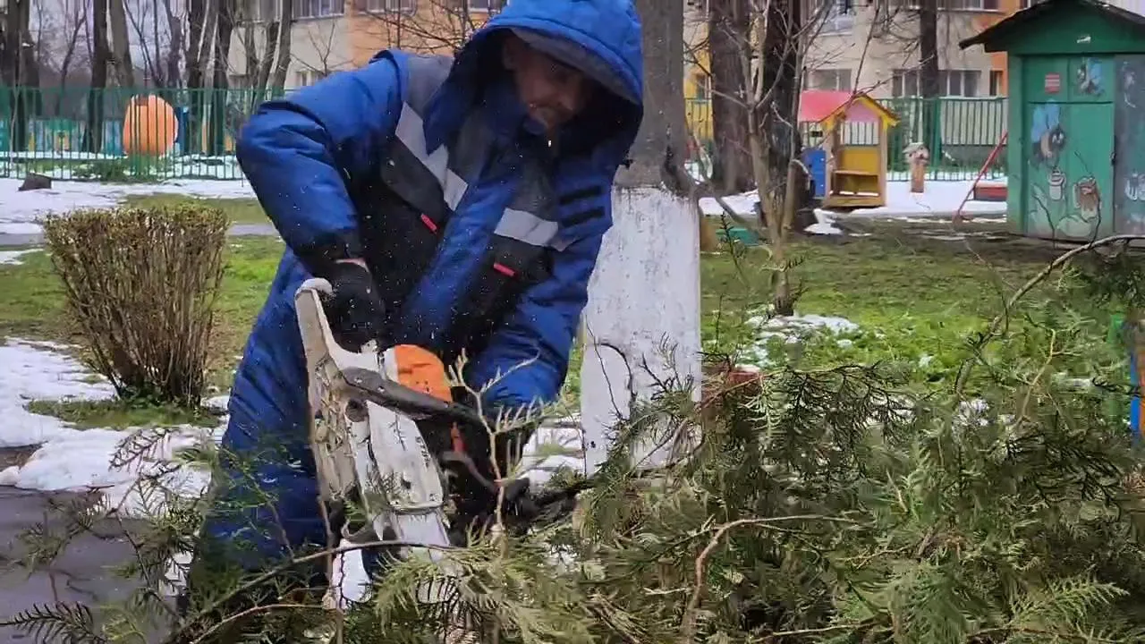 В городе Бронницы, на улице Льва Толстого, 15А, специалисты МБУ «Благоустройство» продолжают ликвидировать последствия недавнего циклона. Они расчищают территорию дошкольного отделения гимназии имени Пушкина — детского сада «Марьинский». Из-за сильного снегопада и ветра здесь упали три туи и липа.