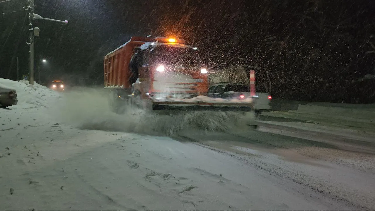 Около 23:00 две комбинированные дорожные машины вышли на маршрут с пескосоляной смесью. Одна машина двигалась по осевой и отвалом разбивала снег, вторая смещала его к краю, расчищала обочину и разбрасывала смесь. Руководитель смены контролировал работу через систему мониторинга: приложение фиксировало передвижение техники и помогало отслеживать выполнение заданий.