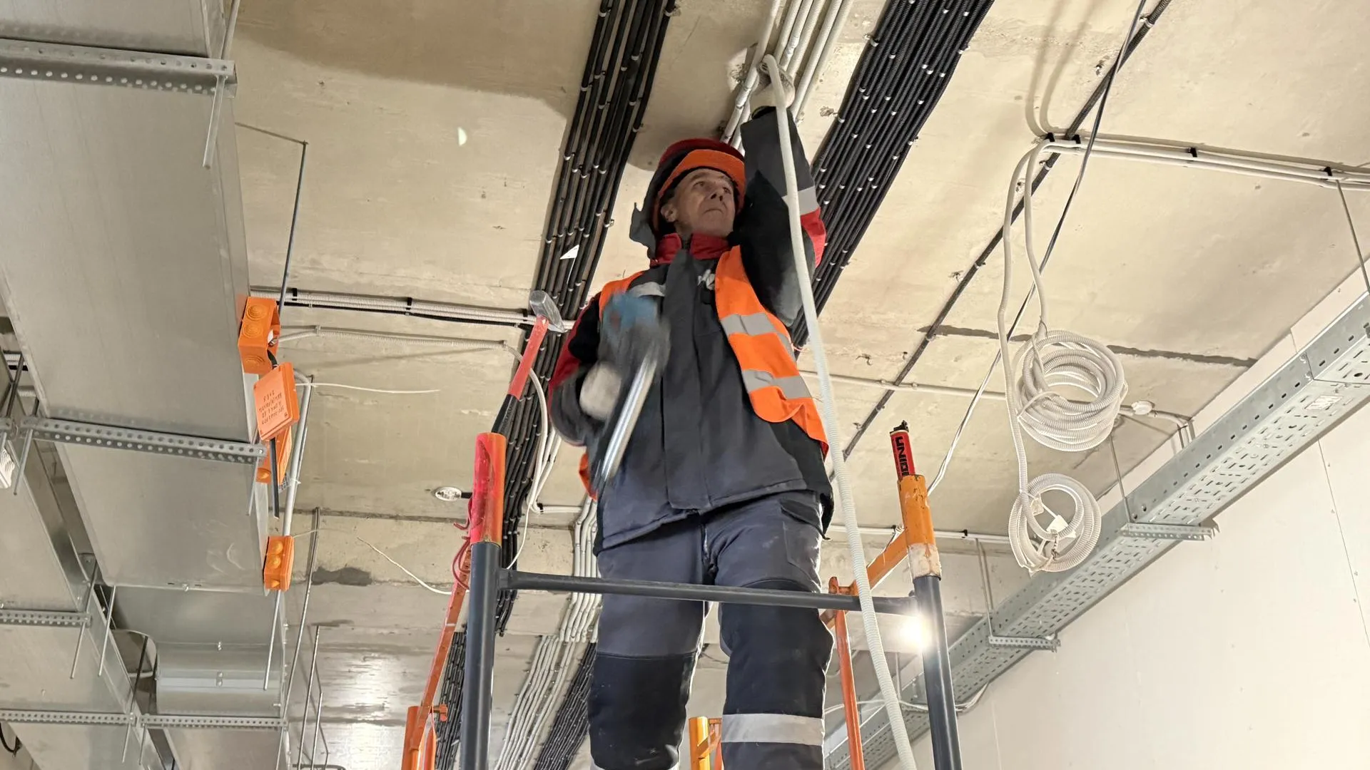 Сейчас на объекте активно работают над внутренними коммуникациями: монтируют вентиляционные системы и отопление, прокладывают электричество и слаботочные сети, включая системы безопасности и видеонаблюдение. Параллельно не прекращаются фасадные работы, благодаря которым здание постепенно обретает завершенный вид.