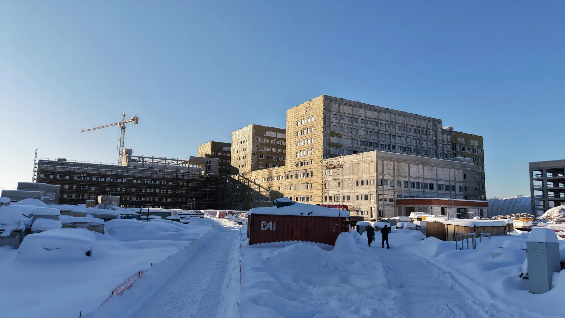 В микрорайоне Ольгино идет активное строительство многофункциональной больницы, которая станет крупнейшей в Московской области. Строители занимаются фасадными работами и утеплением корпусов. Одновременно с этим ведется монтаж наружных инженерных сетей, строительство внутренних перегородок и сварочные работы.