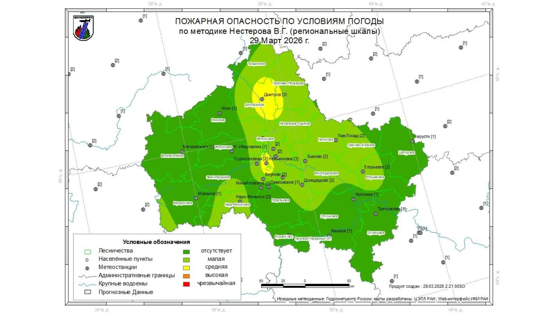 На 29 марта на большей части территории Московской области прогнозируется первый класс пожарной опасности. Второй класс ожидается в Виноградовском, Егорьевском, Звенигородском, Московском учебно-опытном, Ногинском, Орехово-Зуевском, Подольском и Сергиево-Посадском лесничествах, а третий — в Дмитровском.