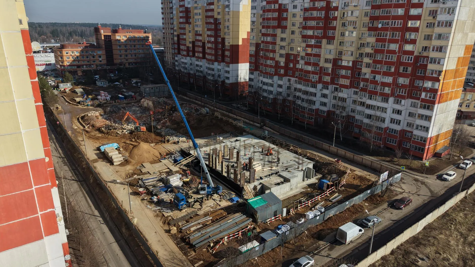 На площадке работают 36 строителей, трое инженерно-технических сотрудников и пять единиц техники — два крана, два экскаватора и мини-погрузчик.