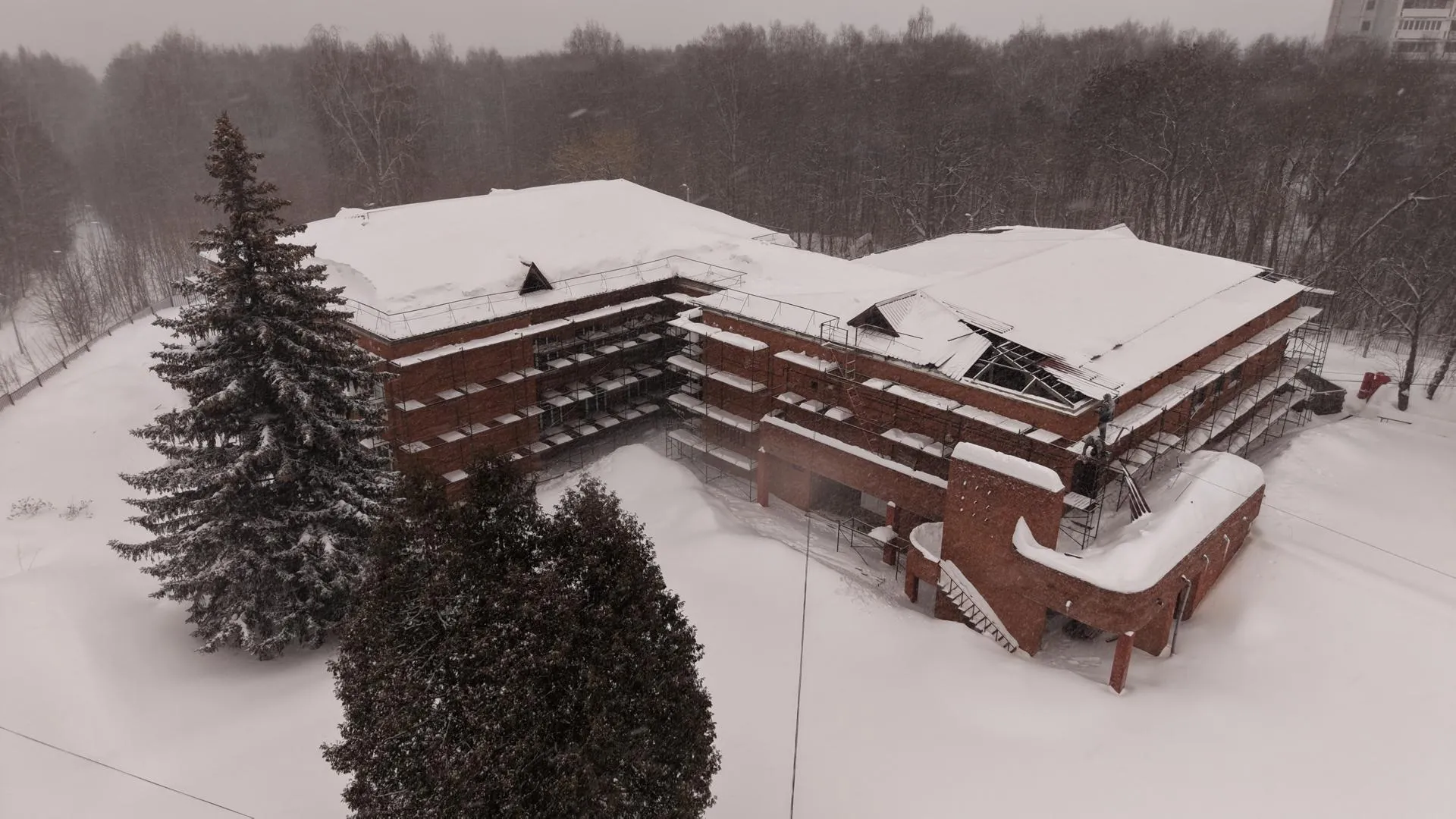 В микрорайоне «В» города Пущино продолжается ремонт детской музыкальной школы. Уже выполнено более 10% от общего объема работ. Строители демонтируют старые конструкции и приступили к ремонту кровли.