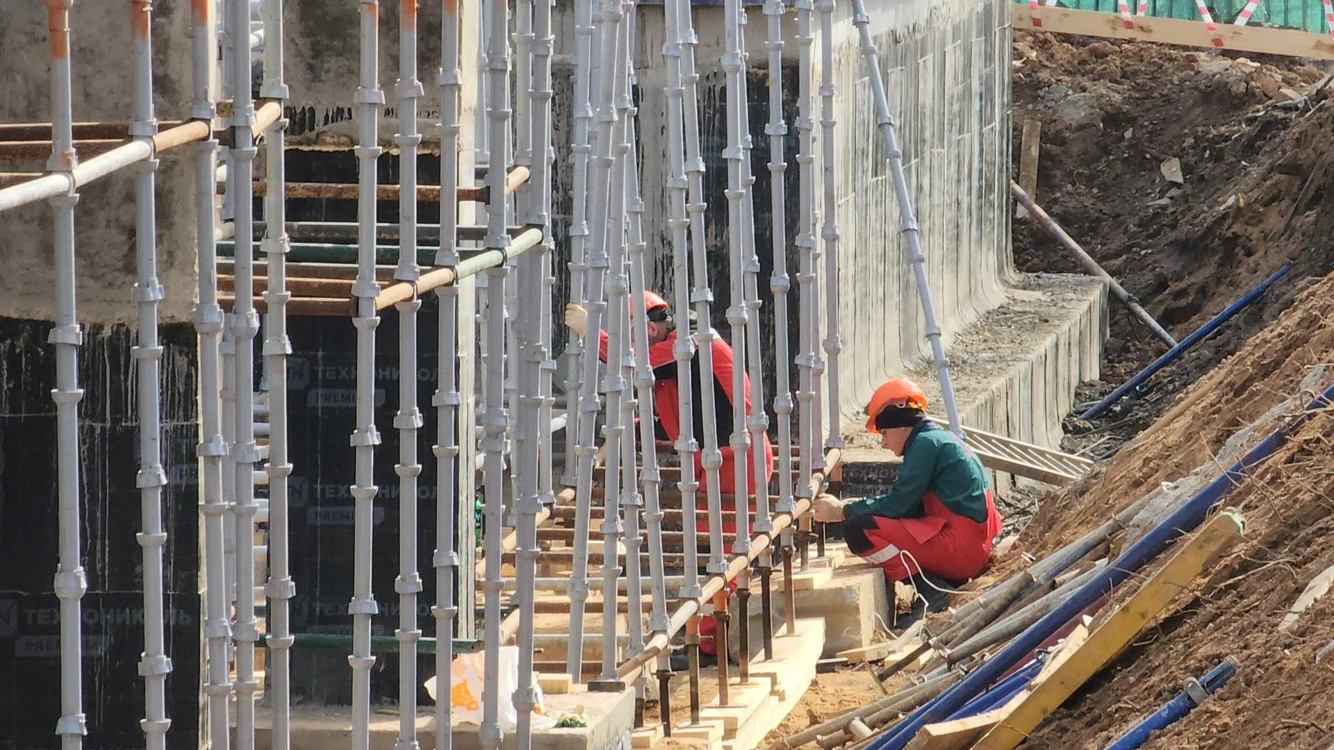 На строительной площадке трудятся две бригады: одна обвязывает проволокой арматуру и создает прочный каркас для бетонных конструкций, другая разбирает опалубку и устанавливает ее на подготовленные участки. Использование крупнощитовой разборной опалубки позволяет значительно ускорить строительный процесс.
