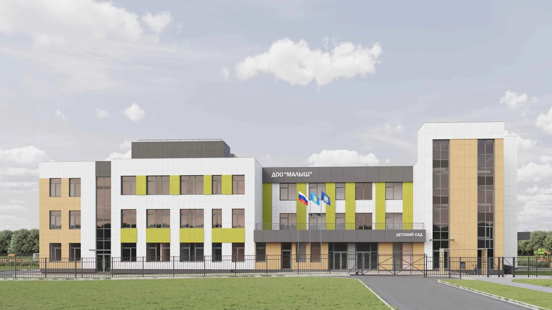 На прилегающей территории расположатся игровые и спортивные площадки. Завершение строительства запланировано на 2027 год.