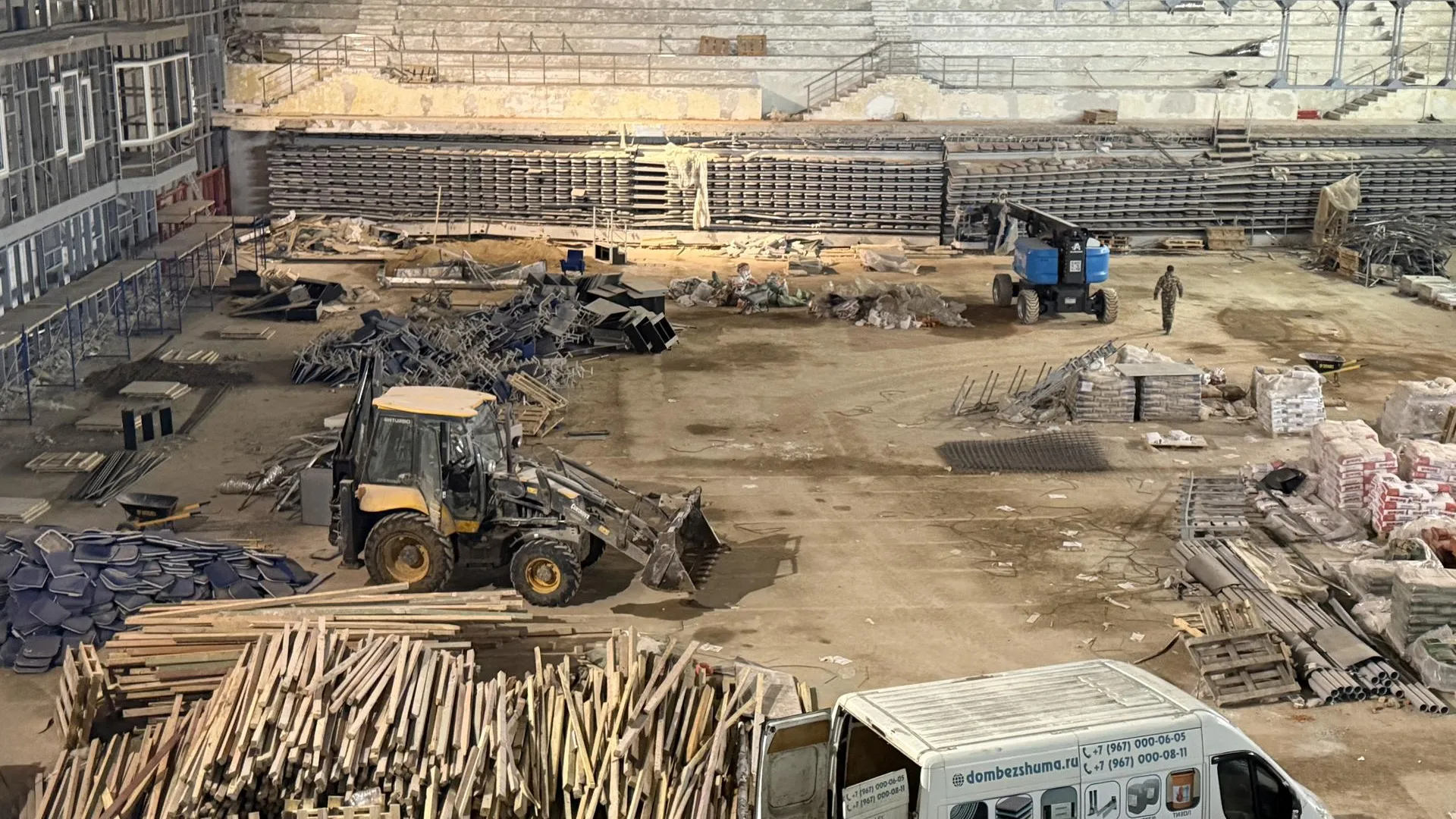 На объекте работает более 50 человек и задействовано 2 единицы техники. Специалисты занимаются сразу несколькими задачами: завершили черновую отделку, приступили к укладке плитки и штукатурке в жилых помещениях. В основном спортивном зале идет демонтаж оборудования, одновременно обрабатываются металлоконструкции противопожарным составом.