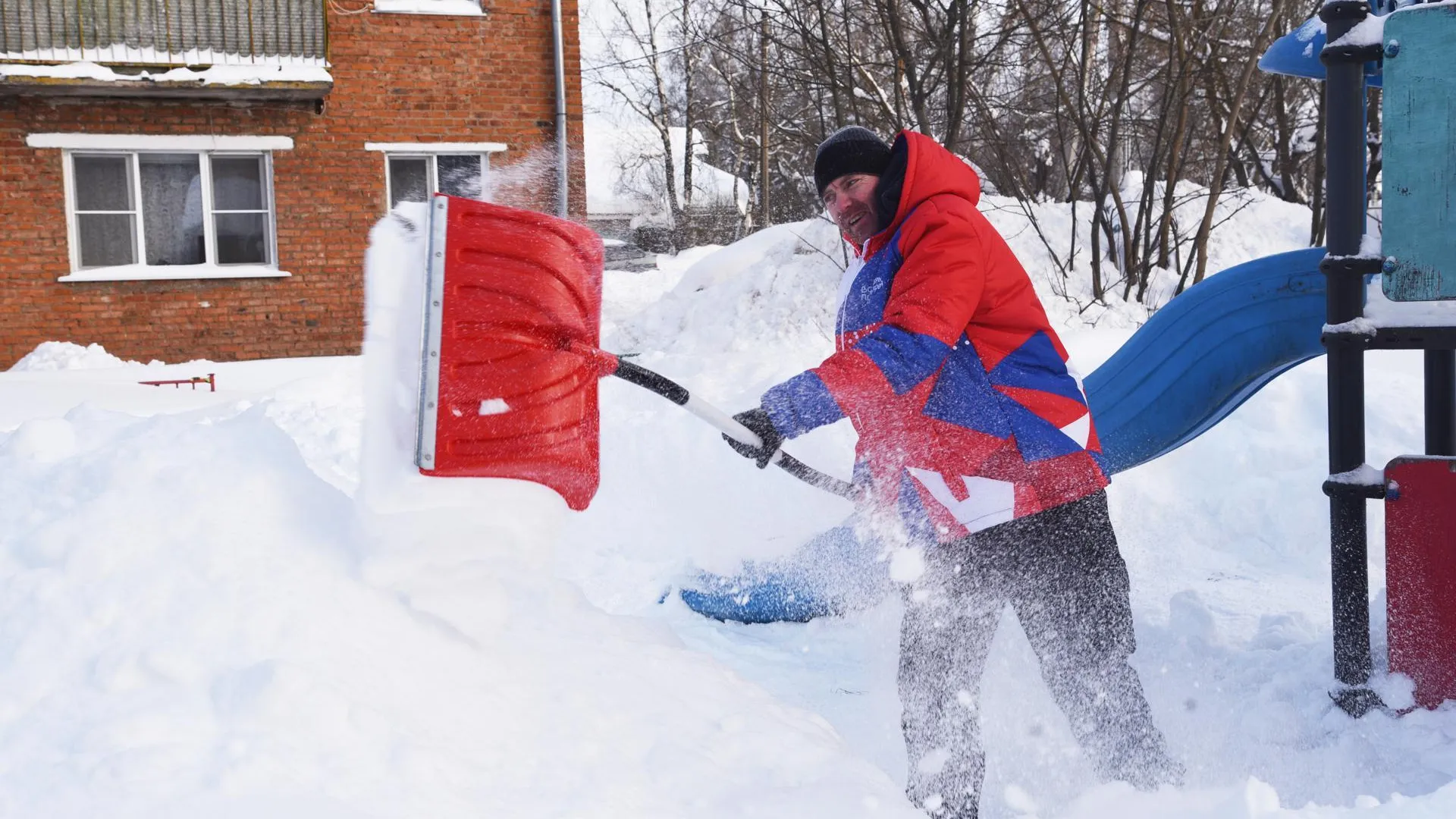 Волонтеры расчистили детскую площадку в Лотошине от снега