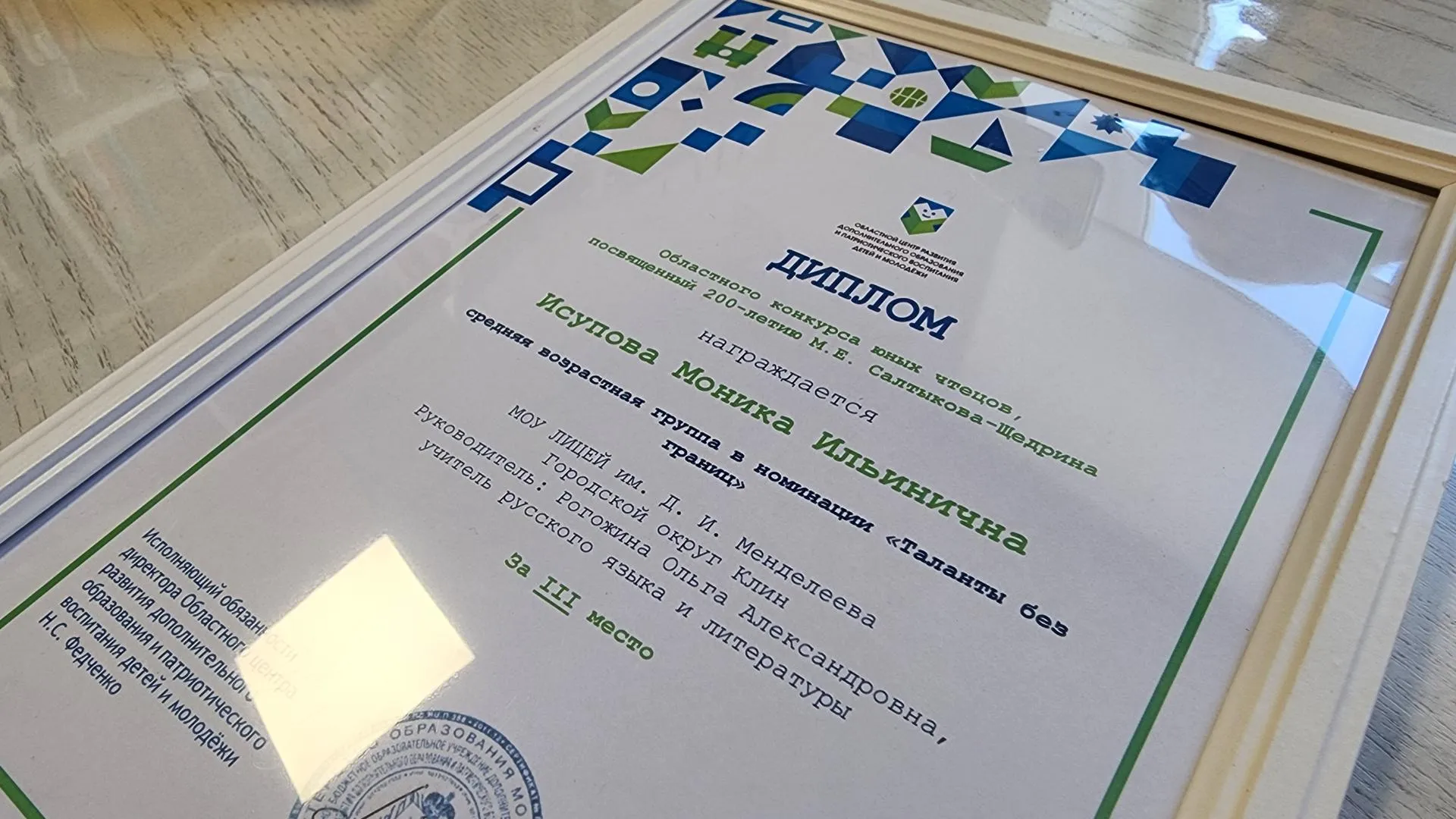 Учитель русского языка и литературы Ольга Рогожина вручила ей диплом за третье место в областном конкурсе юных чтецов, посвященном 200-летию М. Е. Салтыкова-Щедрина. Для участия в конкурсе Моника выучила наизусть отрывок из сатирической сказки «Повесть о том, как один мужик двух генералов прокормил».