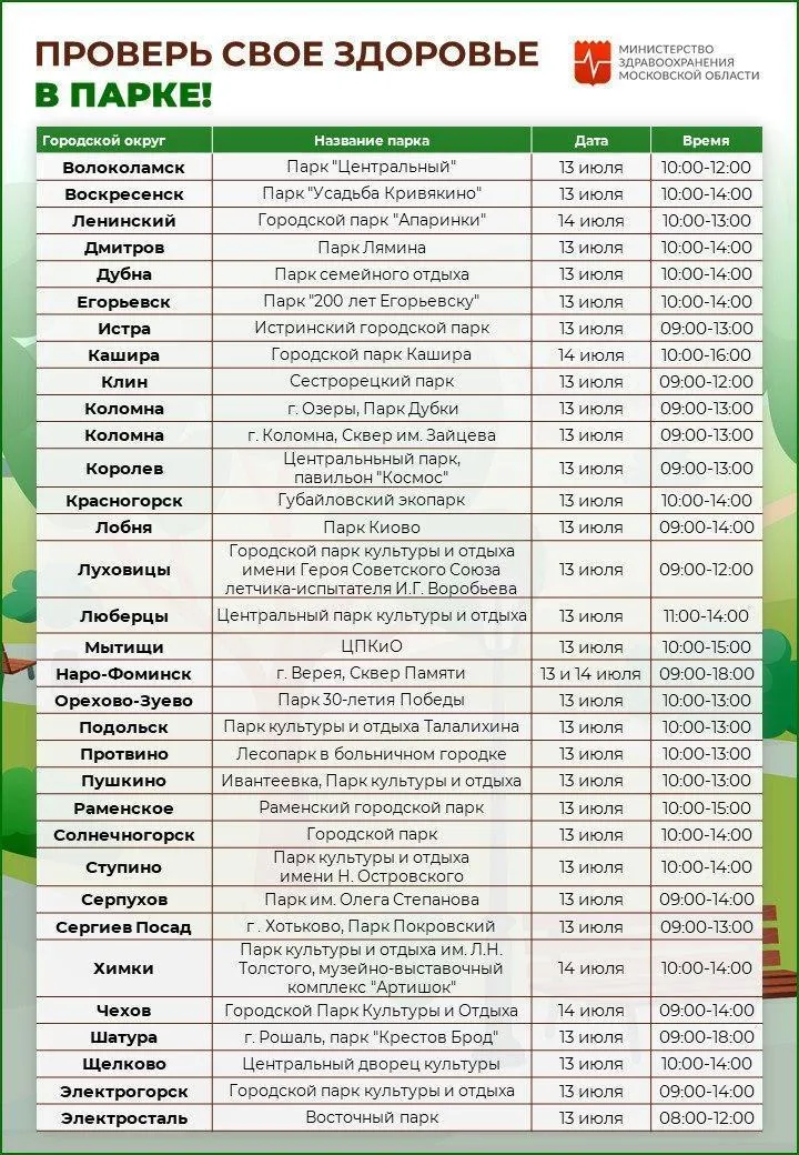 Жители Подмосковья смогут пройти осмотр у врача в парках 13 и 14 июля. Акцию проведут в 33 местах, в том числе в Дубне, Егорьевске, Серпухове и других муниципалитетах.