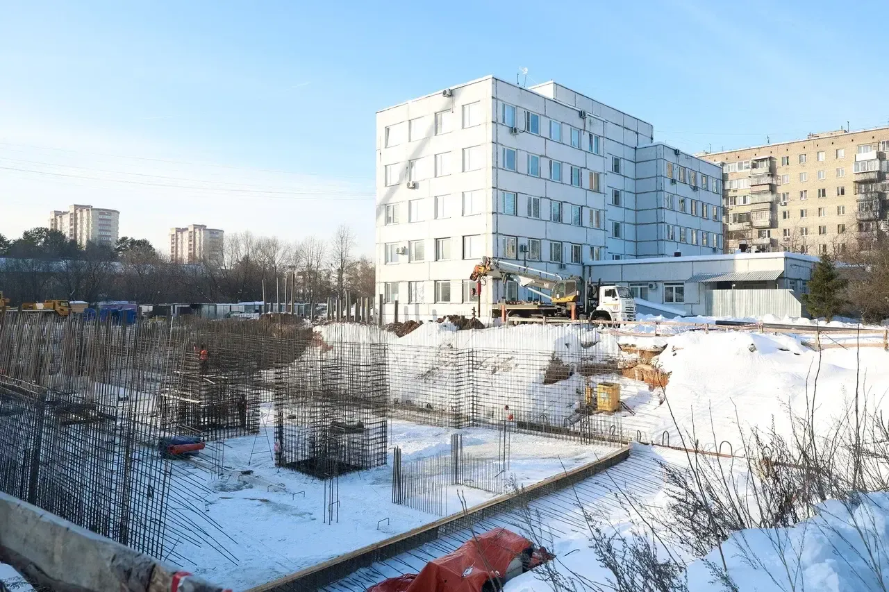 Здание начали строить в декабре 2024 года, однако из-за невыполнения подрядчиком обязательств контракт расторгли. Через 11 месяцев работы возобновили уже с другой компанией. Сейчас строители усиливают стены котлована, понижают уровень грунтовых вод и армируют подземную часть.