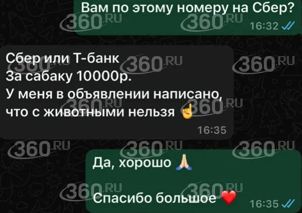 По словам хозяйки животного, она предупреждала владельца квартиры. Более того, в распоряжении 360.ru есть скрин переписки — собеседник девушки действительно соглашается на собаку и предупреждает о необходимости доплатить 10 тысяч рублей.