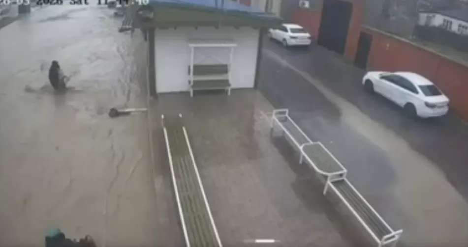 На кадрах, опубликованных RT, можно увидеть, что мужчина прячется от дождя под крышей снаружи кафе, но, увидев, что происходит, выбегает из-под укрытия и бежит через улицу. Через несколько секунд он снова появляется в кадре, неся на руках девочку и заходя с ней в кафе. Женщина параллельно пробирается туда же.